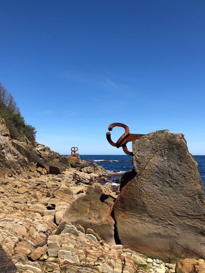Just a little further along the beach from the entrance to the Monte Igueldo funicular railway is El Peine del Viento or “The Comb of the Wind“, a trio of steel sculptures designed by Eduardo Chillida and arranged by architect Luis Peña Ganchegui. On a windy day these sculptures are relentlessly buffeted by angry waves and the area can become quite dangerous. We saw them on a still morning, but there was a sense of quiet anticipation of the inevitable, as though patiently waiting for the next onslaught of water.