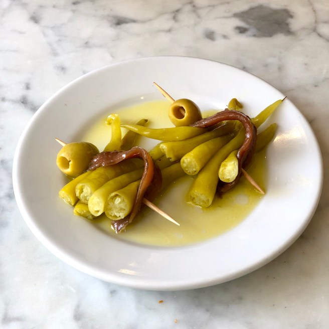 San Sebastián is a foodie’s paradise and one major draw is pintxos, the local Basque tapas. Locals enjoy going from bar to bar sampling each establishment’s specialties over a glass of wine. I’ve written about some of San Sebastián’s best pintxos here. One of my favourites which you can get at most pintxos bars is gilda: sweet, pickled guindilla chilli peppers skewered with anchovies and green olives – divine!
