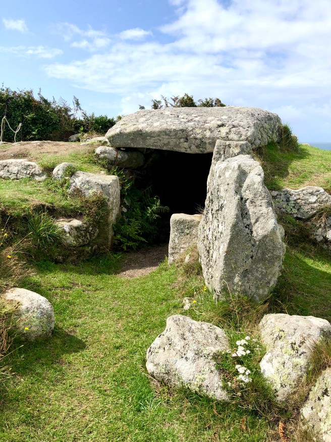 At the North West tip of St Mary’s (the last before you get to Bar Point) we came to the Halangy Iron Age Village. I love that you can see the outlines of rooms and dwellings where a community lived so long ago, but also how the purple heather has now made the village it’s home. From the sea you can actually make out an even older settlement closer to the beach where the villagers would have lived before sea levels rose. At the top of the village is the Bronze Age Bant’s Carn Burial Chamber and turning back towards the sea the views over the village below and across to Tresco are spectacular.