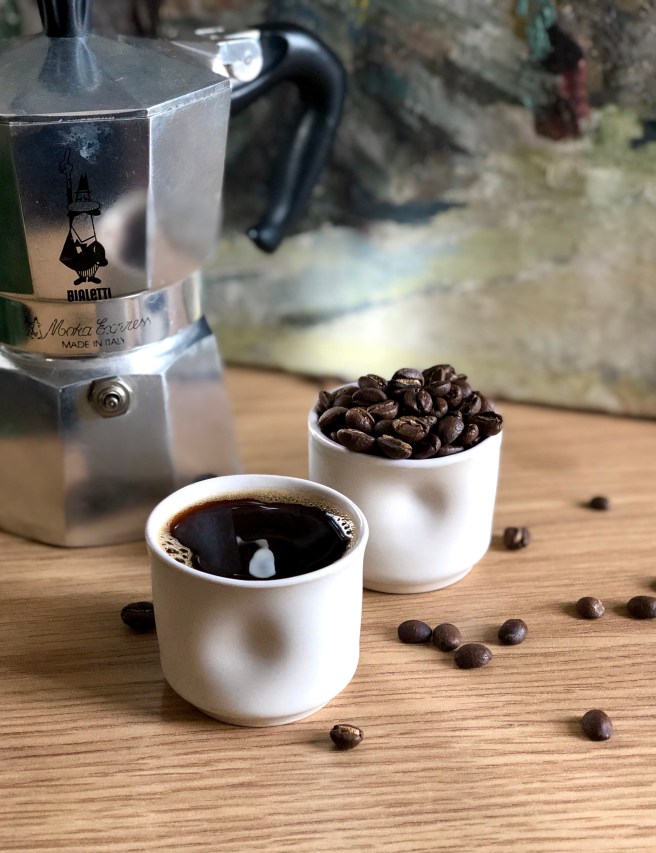I have to take a minute to tell you about these sleek, gorgeously dainty espresso cups by Emilia Radlinska, a ceramic artist in South West London who I met during Merton Arts Festival this weekend. Her porcelain work plays with contrasting textures using soft satin or subtly coloured glazes with slender curves and pinched sides, or dark tones and tiny intricately applied dots of slip that create a surprisingly pleasing spiky texture. These cups have a sensuous, silky, satin glaze on the outside making them really satisfying to hold, and the inside has a white glaze with hints of pinks and blues. They turned out to be a perfect textural pairing for the flavour of the coffee. I’m actually now curious as to how the coffee would taste if I tried it with a pair of Emilia’s black spiky cups?
