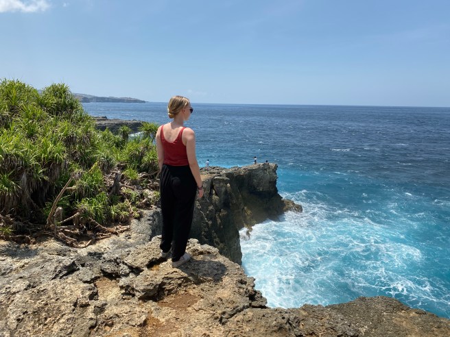 I’m currently staying on Nusa Lembongan, an island to the south east of Bali which is fairly quiet (by Indonesian standards) and absolutely stunning. The coastline is rugged and constantly under siege from the huge crashing waves, and yet the water is so blue and strangely inviting! I haven’t been able to snorkel here as the swell has been particularly bad and I think the boat rides would wreak havoc with my seasickness, but I’ve been spending plenty of time on cliffs looking out in awe over the sheer magnificent power of the sea.