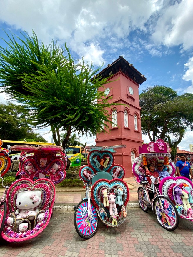 Next I wandered down the hill past the Admiral Cheng Ho Gallery where they have an old fire engine and bulldozer displayed outside. I kept to the right hand side of the car park and reached the red brick Dutch Stadhuys, clock tower, Christ Church and of course a little windmill. There were plenty of Melaka’s famous trishaws each with their own theme including Hello Kitty, Minions, or everyone’s favourite: Baby Shark.