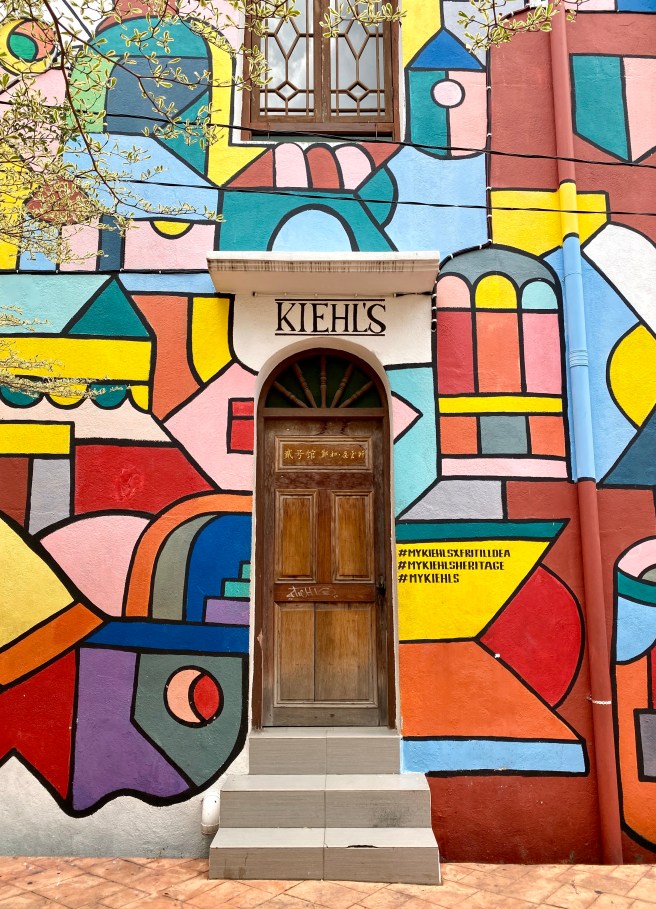 Across the bridge I turned right and followed the walkway along the river where there are a few little cafes and eateries and some cool street art. This is where you can find the famous Kiehl’s Street art building with its colourful geometric pattern. At the Kiehl’s building I turned left on to Jalan Tukang Besi where I popped in to have a look at the Orangutan House with T-Shirts and original art works by local artist Charles Cham.